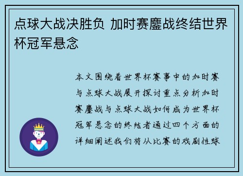 点球大战决胜负 加时赛鏖战终结世界杯冠军悬念